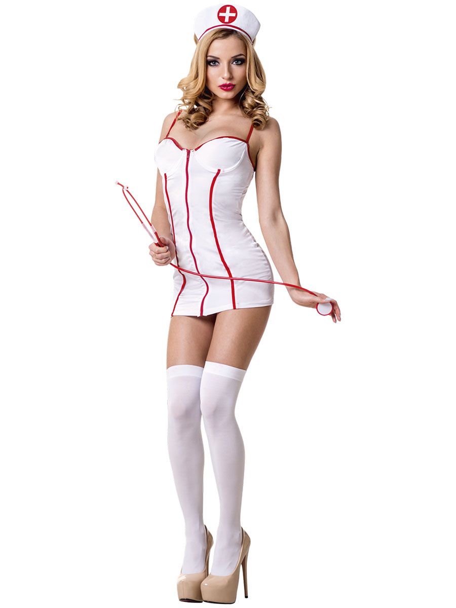 Халат на молнии, великолепно облегающий и подчеркивающий линии фигуры, ярко-красная отделка, кокетливая шапочка купить этот костюм медсестры можно для костюмированной вечеринки или "взрослой" ролевой игры.